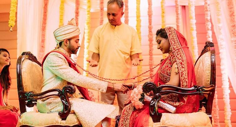 During this ritual, the bride and groom exchange garlands twice, first time of which the groom has to stand on a stool so that he is standing on higher ground, and for the second round he steps down and they are on equal ground.