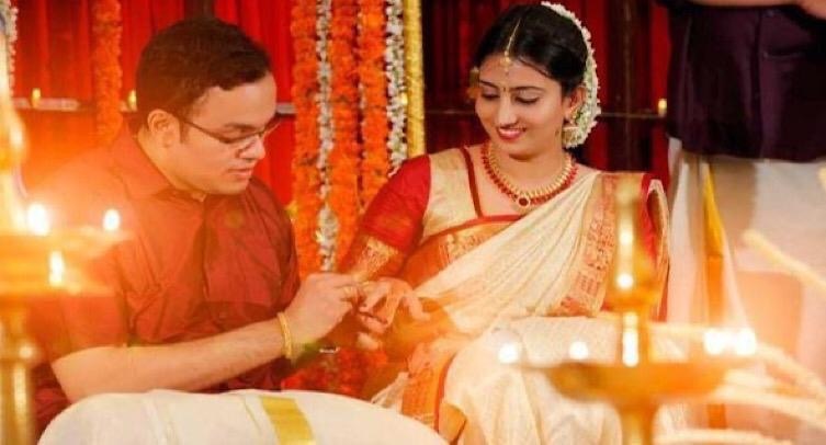 In the Malayalam wedding, the bride wears a sari is named Mundu. The bride is ornamented with the normal Jewelry. The groom also wears traditional dhoti and angavastram.